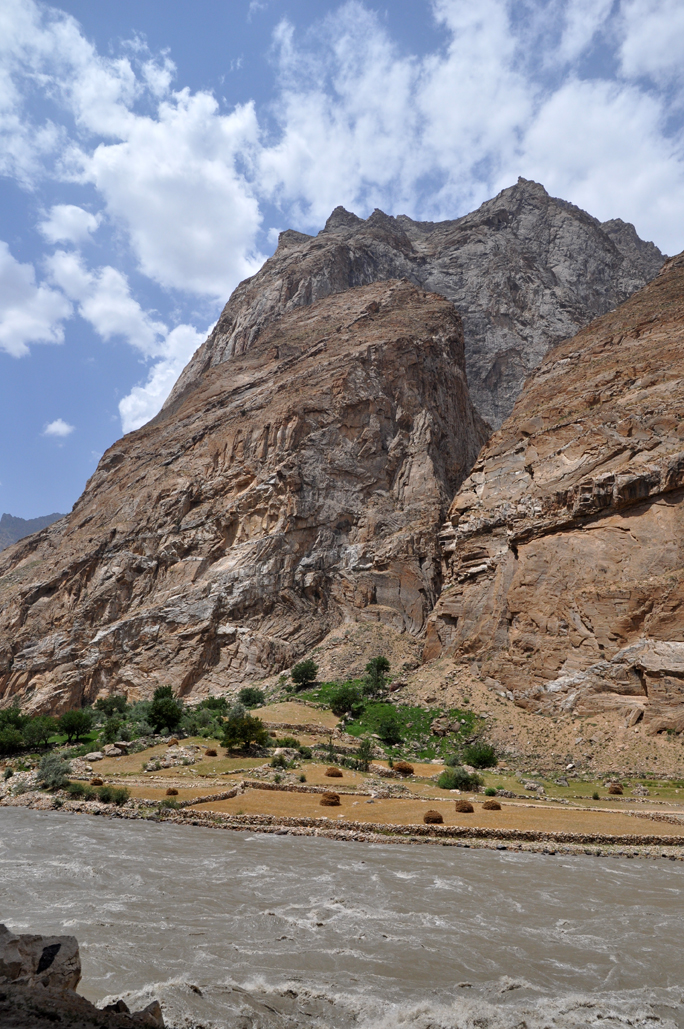 From here we drove south along the Afghan border to the town of Khorog for the night. The scenery was beautiful as we followed the swift flowing Panj River that twisted and turned kilometre after kilometre. Each projecting bend on either side seemed to be populated with a tree and field filled village.